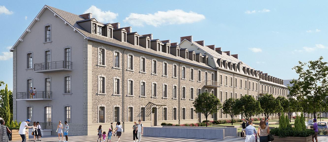 - Réhabilitation haut de gamme d’un édifice militaire du XIXe siècle : façades en pierre de taille et granit, grandes ouvertures (vues dégagées), ascenseurs, isolation optimisée.